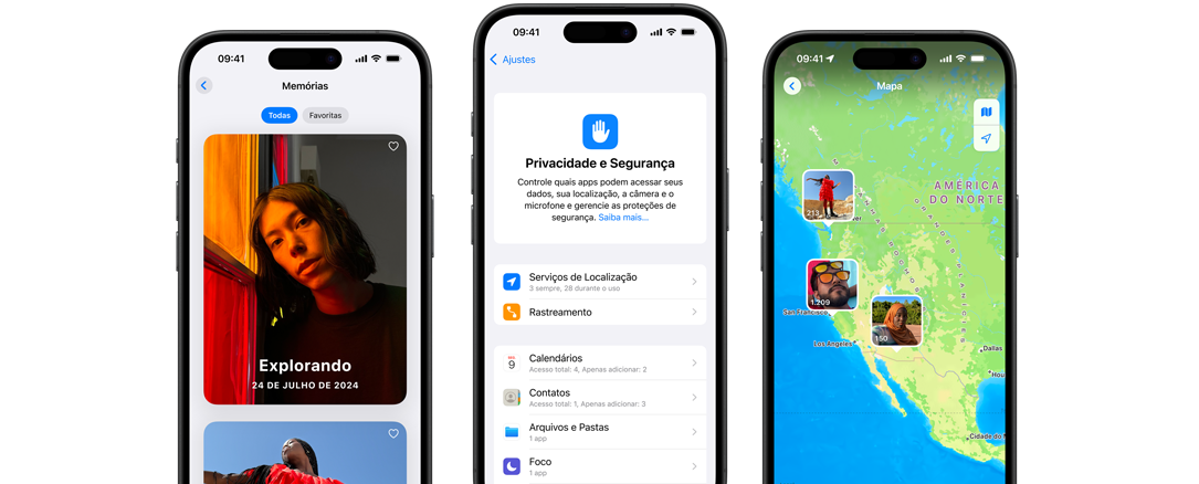 Muitos dados pessoais ficam nos aparelhos da sua família. Por isso, criamos hardware e software pensando em manter essas informações protegidas. Também usamos algumas das tecnologias de segurança mais avançadas em nossos produtos, como o Touch ID e o Face ID. E facilitamos para que os pais definam controles de privacidade nos dispositivos dos seus filhos