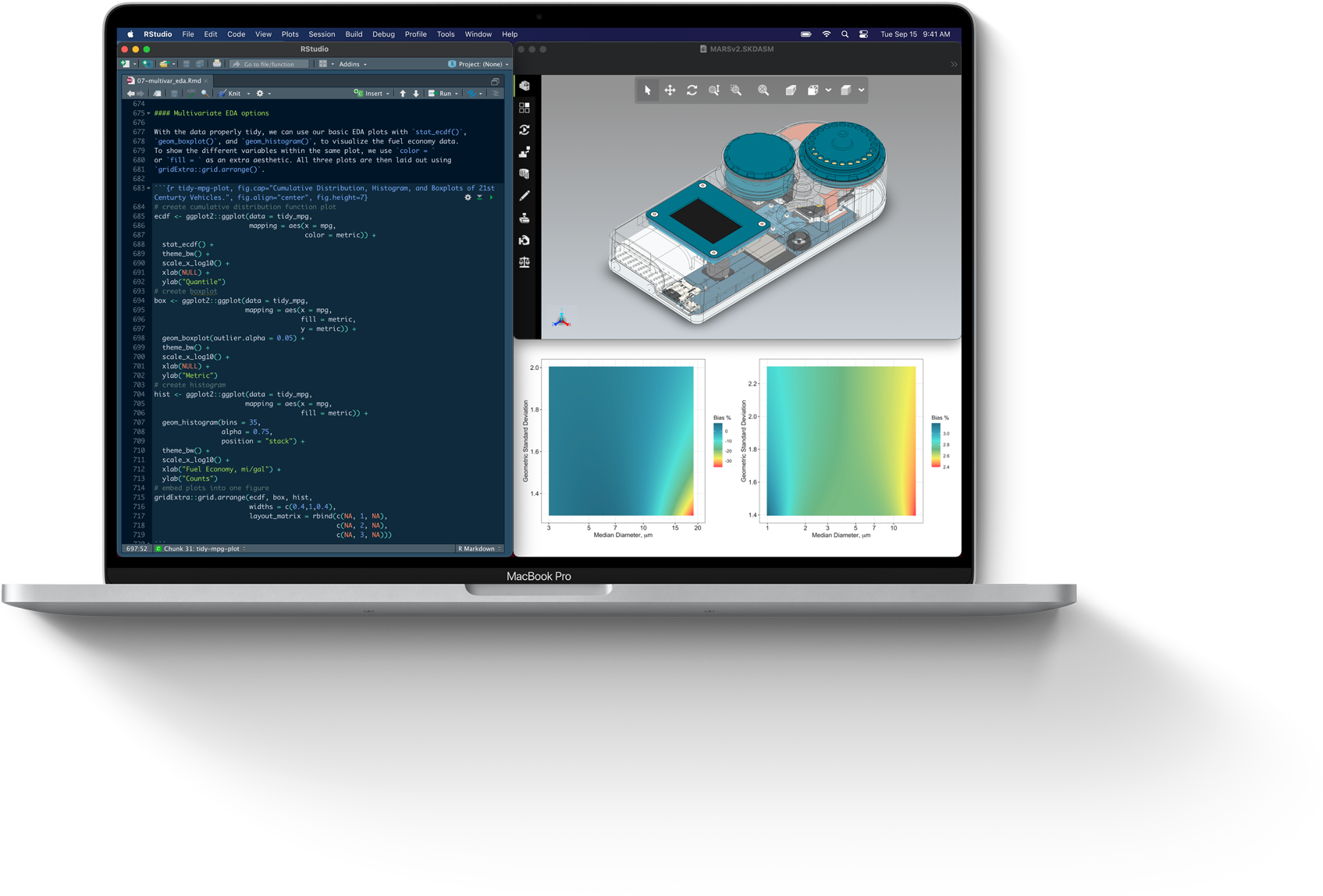 MacBook Pro. Grâce à son MacBook Pro, John Volckens analyse d’énormes jeux de données sur la qualité de l’air et convertit les résultats en graphiques spectaculaires sur des tableaux de bord interactifs. Tout ça en même temps.