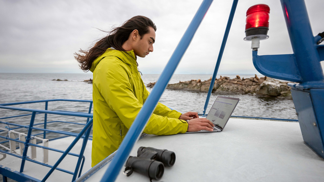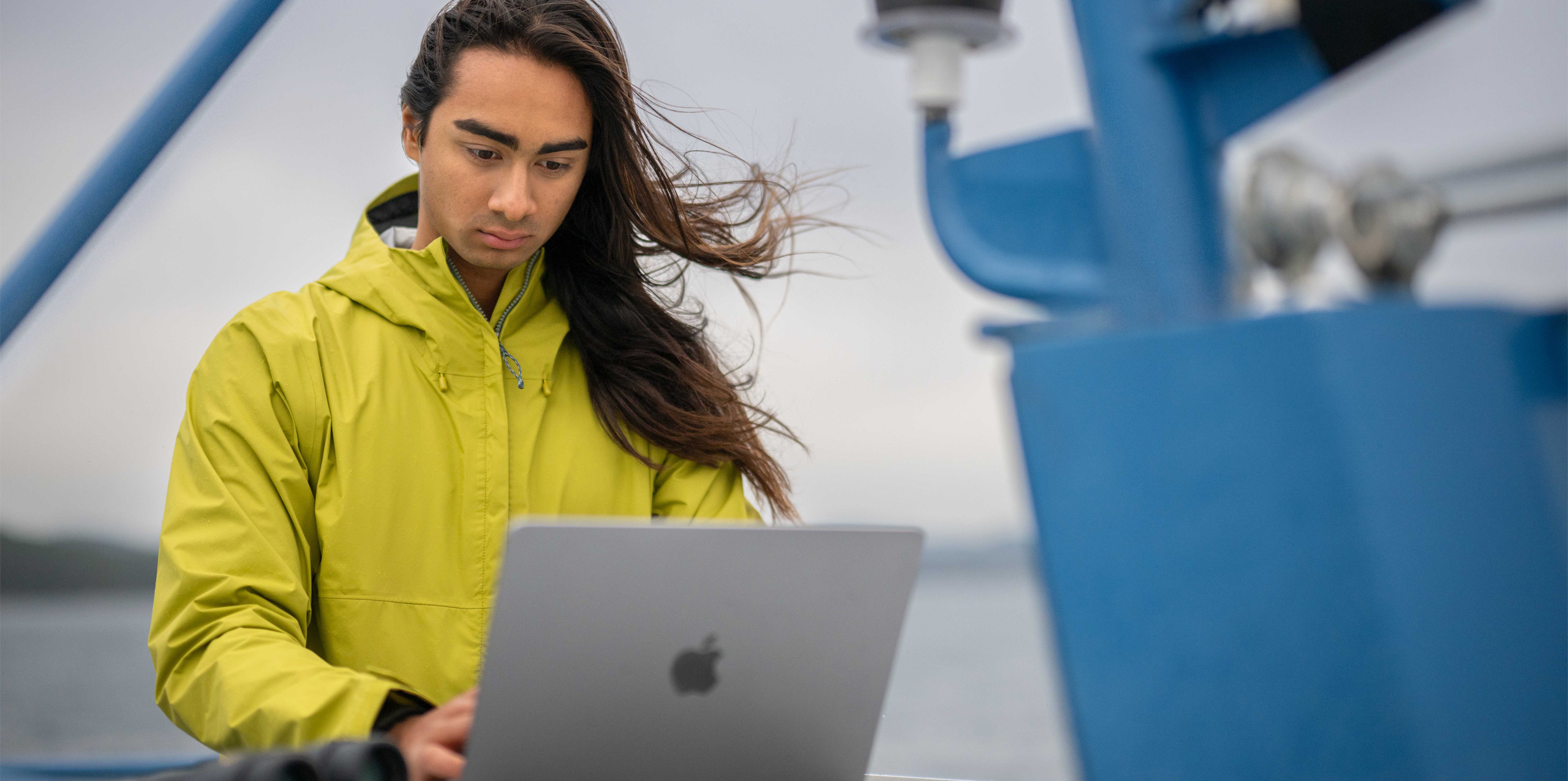 La technologie Apple aide également Bodhi à mener et à synthétiser ses recherches universitaires: par exemple, illustrer les impacts de l’activité des navires sur la population menacée des orques résidentes du Sud, dans la mer des Salish. Muni de son MacBook Air, de son iPhone et de ses jumelles, il aborde le travail de terrain directement sur l’eau. Il cartographie les observations de baleines en utilisant Numbers et Keynote pour créer des organigrammes et des cartes de densité qui montrent les croisements entre les lieux qu’elles fréquentent et les itinéraires de ferry très empruntés, ce qui permet d’identifier une gêne potentielle pour les populations de baleines résidentes. Et avec son iPhone, il prend des photos et tourne des vidéos saisissantes qui documentent ses découvertes.