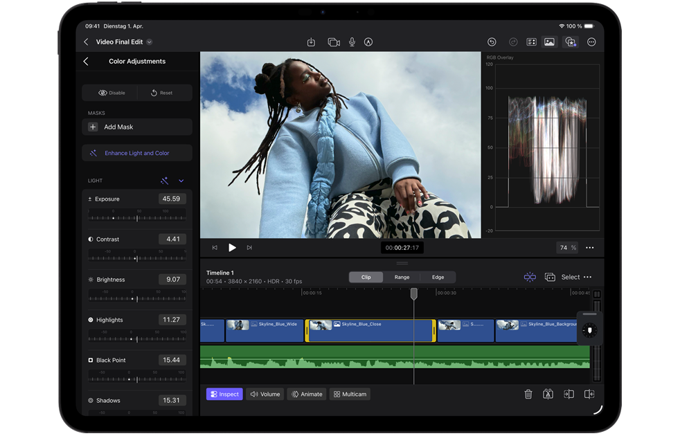 Du kannst Smart HDR Bilder und bis zu 4K ProRes Video aufnehmen und bearbeiten, größere 3D Szenen öffnen und editieren und komplexere KI Modelle ausführen, alles mit Pro Apps.