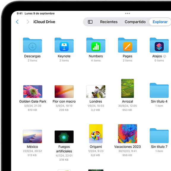 iCloud Drive te permite acceder de manera sencilla y segura a tus archivos y carpetas desde cualquier dispositivo. Puedes verlos en la app Archivos de iOS y iPadOS, el Finder del Mac, el Explorador de Archivos en un PC con Windows y en iCloud.com.