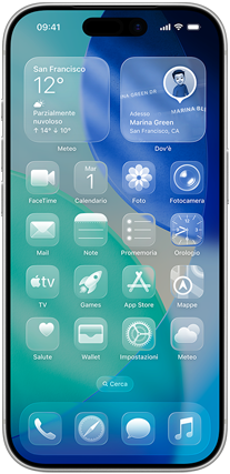 Il display Liquid Glass con icone trasparenti di app come Apple Music, Promemoria, Foto, Giochi, Podcast e FaceTime, che lasciano intravedere lo sfondo