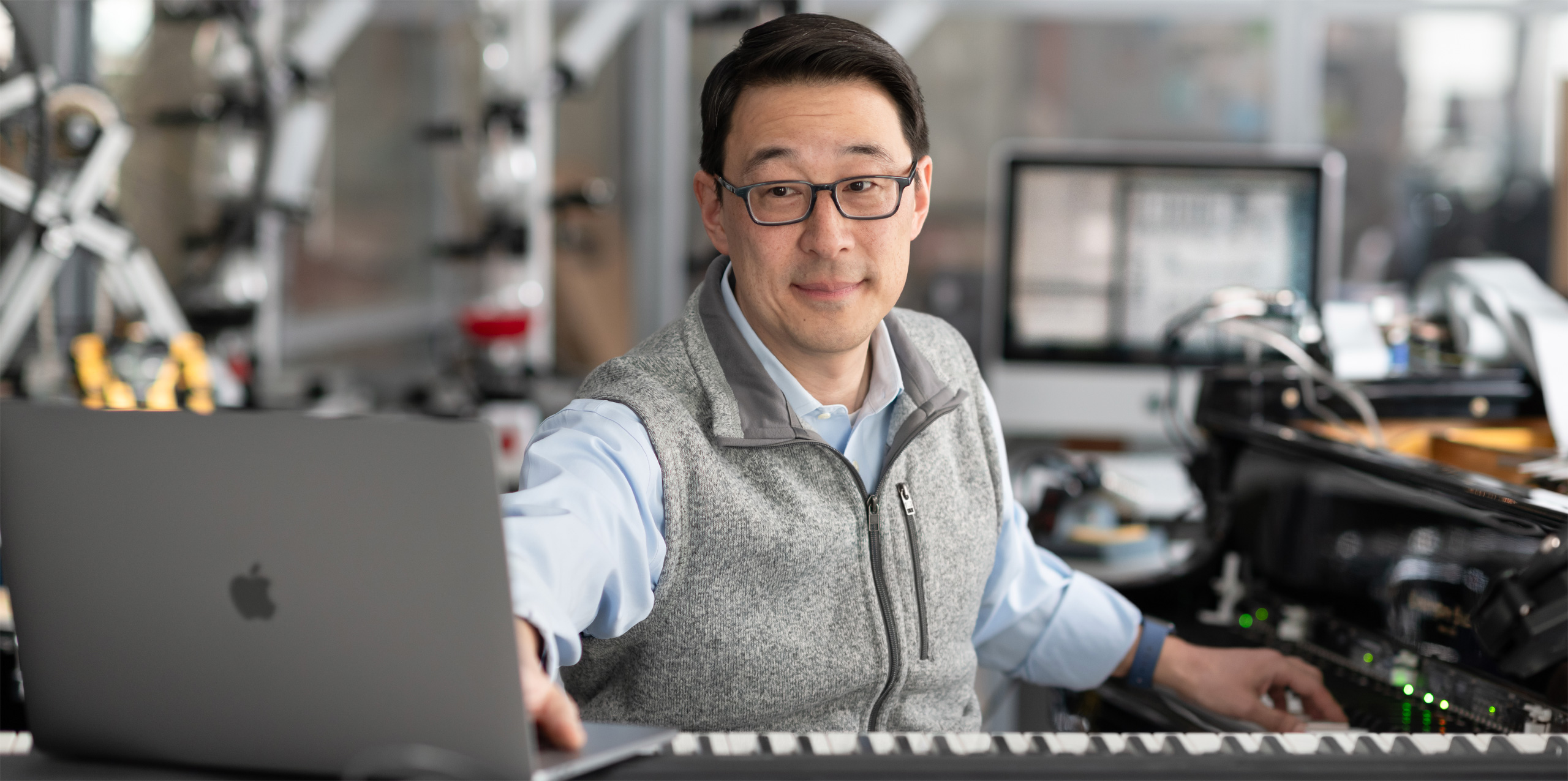 ミュージシャンであり、エンジニアでもあるKim博士の情熱と研究は、パフォーミングアーツとテクノロジーが交差する領域に注がれています。魔法のようなアイデアが思いもよらない場所で生まれる環境を作るために、Kim博士のイノベーションラボではAppleのテクノロジーが使われてい