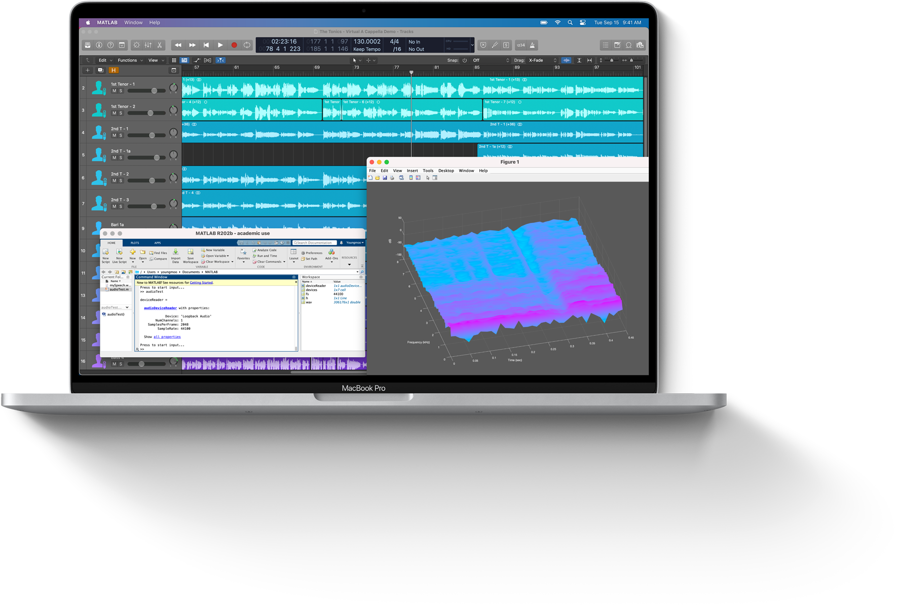 MacBook Pro。Logic ProやMATLABなどのプロ向け音楽アプリや視覚化アプリでの作業も、Macなら軽々。Kim博士が独自に開発した楽器やロボットを使ったマシンリスニング研究の可能性を大きく広げ