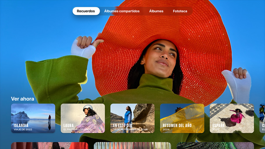 Fotos. Con la Fototeca Compartida en iCloud, es más fácil que nunca revivir momentos increíbles con tu familia en la pantalla grande. También puedes seleccionar Recuerdos como protector de pantalla y ver cómo tus momentos especiales tienen un rol protagónico en la tele.