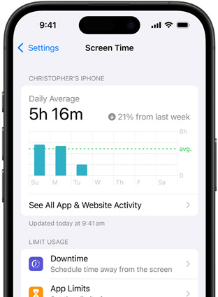 Screen Time gives you a better understanding of the time you and your kids spend using apps, visiting websites and on your devices overall. You can get weekly reports or see specific app usage, notifications and device pick-ups.