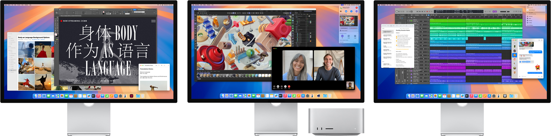 Our hardware and software are designed together. That integration is what enables amazing features like Centre Stage, Spatial Audio and “Hey Siri”. For pro workflows, macOS supports reference modes and fine-tuned calibration so you can match industry standards — whether it’s HD and SD video, or broader uses such as photography, web development, design and print.