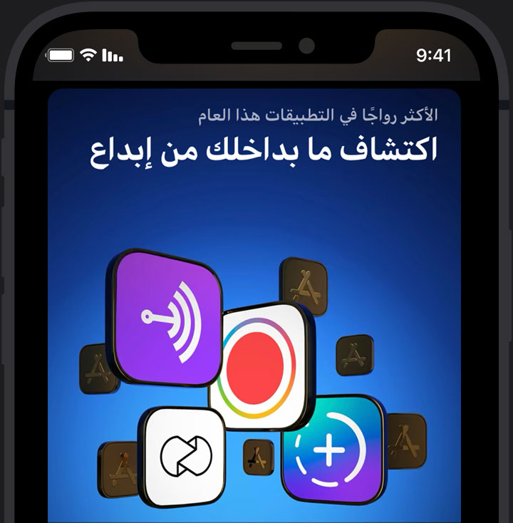 لدى App Store فريق تسويق عالمي غرضه الأوحد تحفيز الاكتشاف والمشاركة، إذ يجري إطلاق الحملات والبرامج لمساعدة مستخدمينا وتزويدهم بالمعلومات وتحفيزهم وفي الوقت نفسه تقديم يد المساعدة لمطورينا في ما يخص الترويج لتنزيل تطبيقاتهم وألعابهم وإعادة تنزيلها.