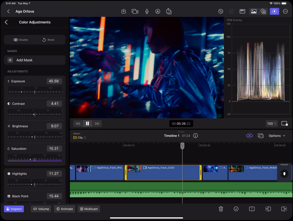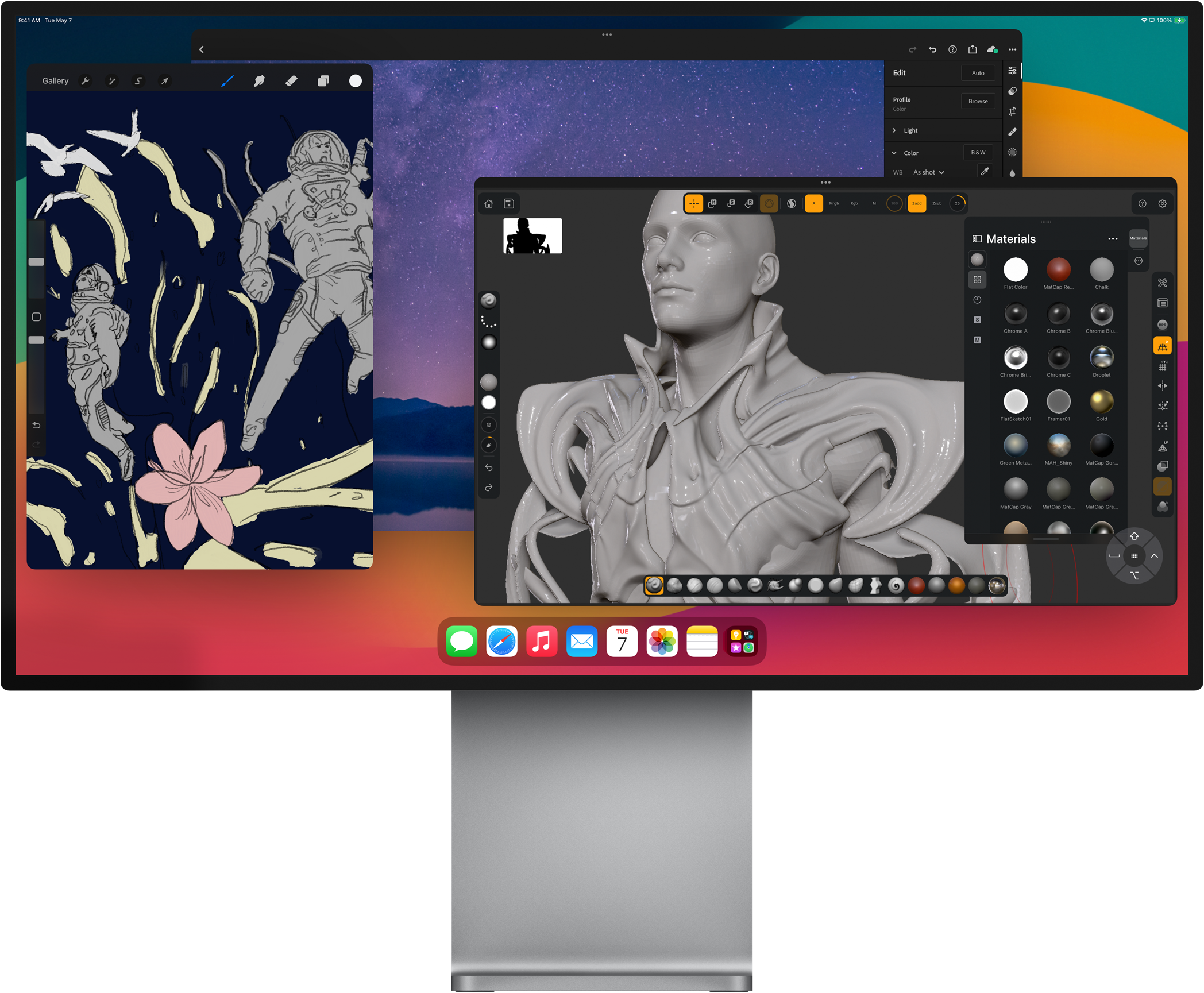 iPad Pro attached to Magic Keyboard in landscape orientation, connected to an external display, images being edited on both