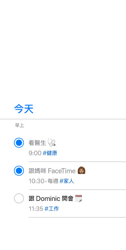 從待辦事項列表到計畫案工作,樣樣牢記在心。出門在外時,你可叫 Siri 快速建立提醒事項;還能運用各種強大工具自訂你的列表和提醒。