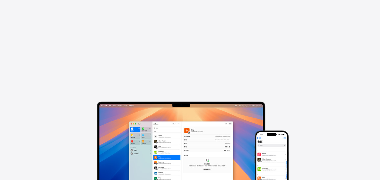 透過 iCloud 管理各裝置上的憑證,並提醒你哪些密碼未達安全標準。你可以建立、